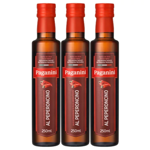 - > Kit c/ 3un Azeite de Oliva Al Peperoncino PAGANINI 250ml